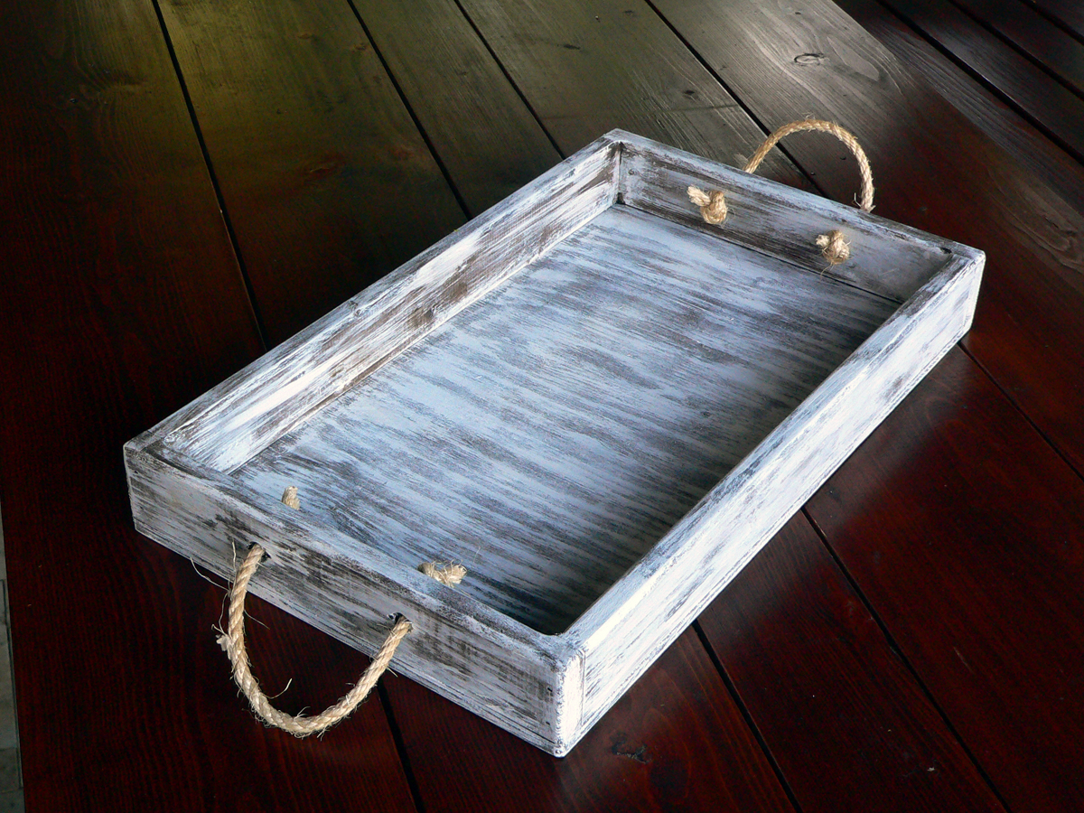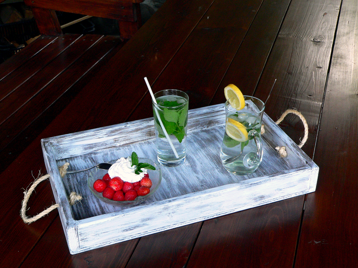 Dřevěný podnos ve vintage stylu s jutovými uchy. Podnos Vám usnadní naservírovat občerstvení kdekoliv v domě nebo na zahradě.