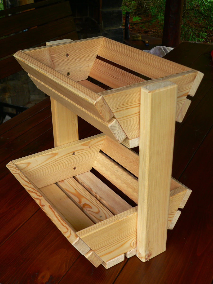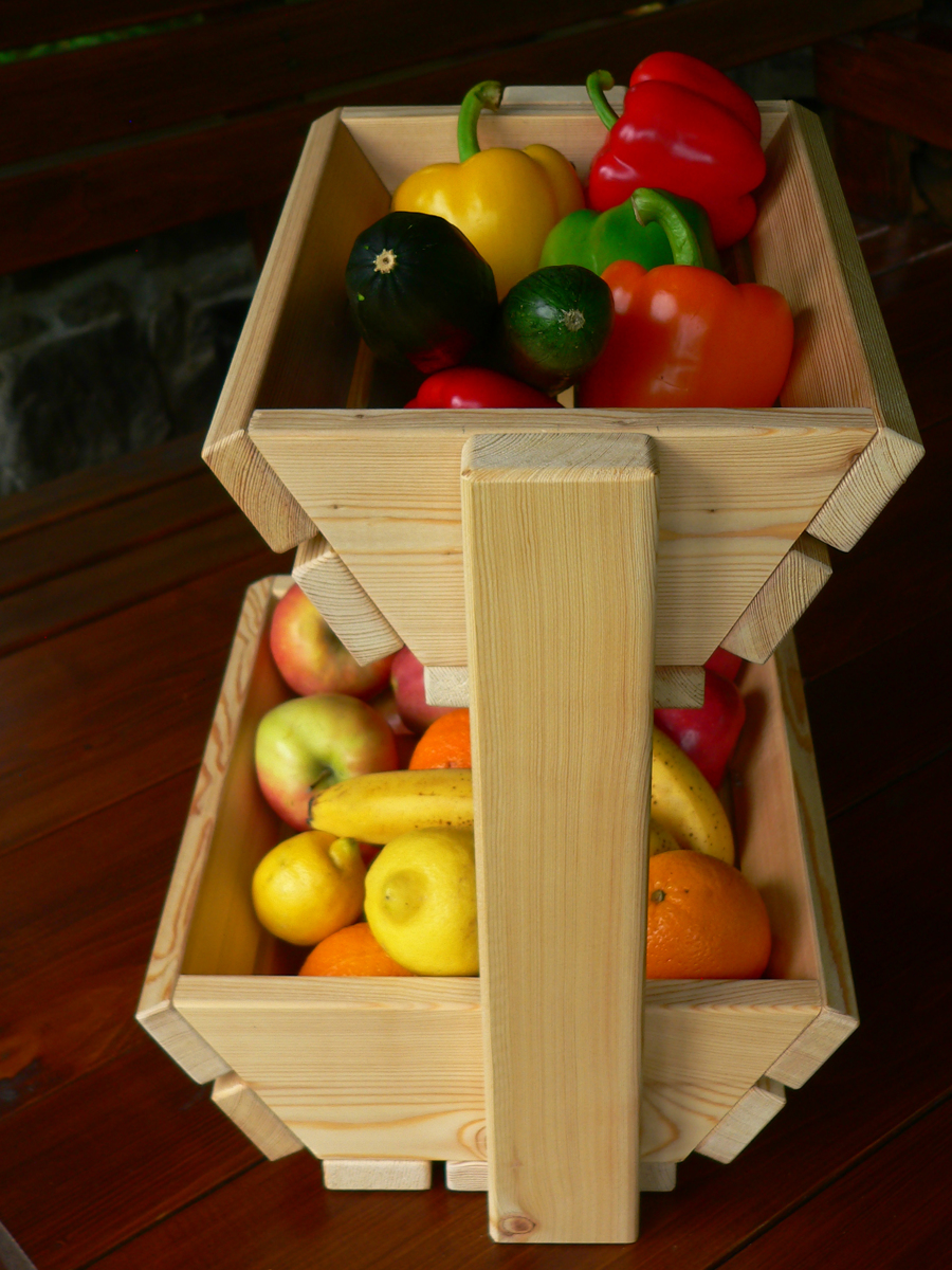 Dvoupatrový kuchyňský dřevěný stojan na ovoce a zeleninu vyrobený z masivu sibiřského modřínu.