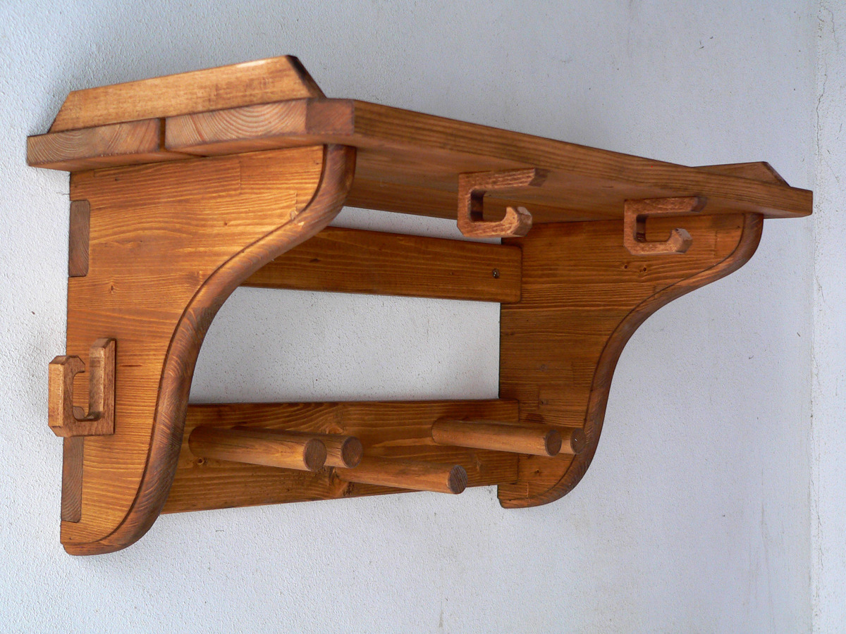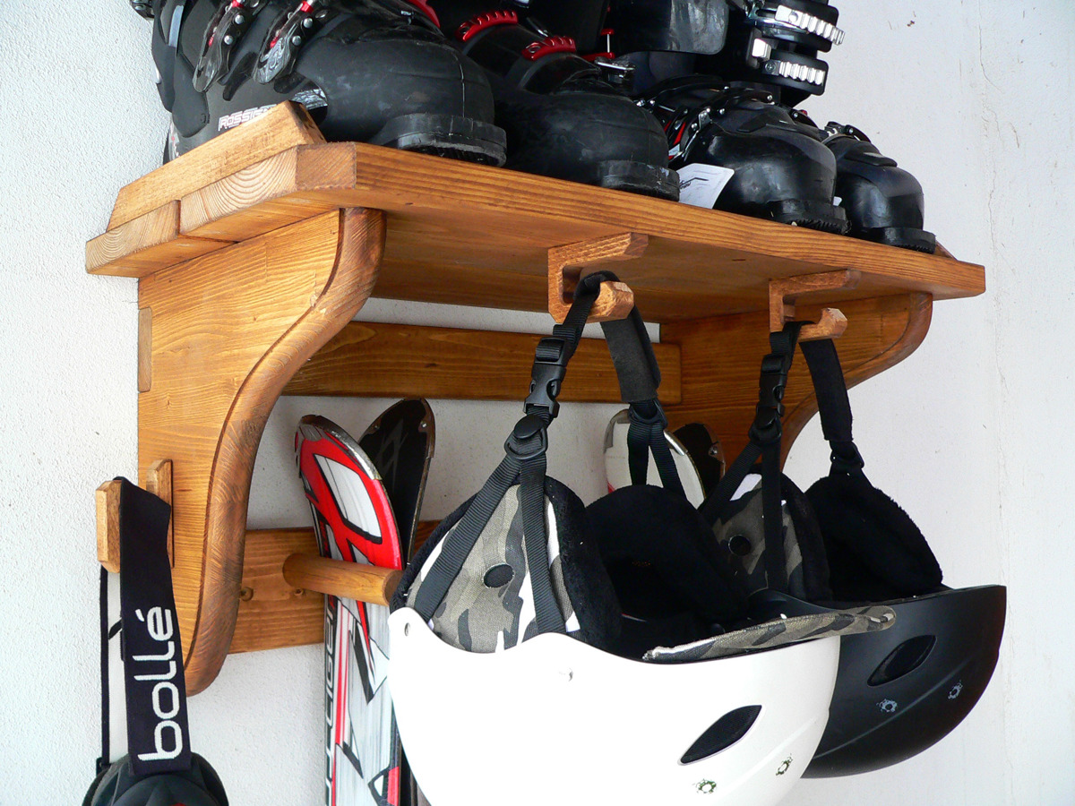 Velmi praktický držák lyží, který umožňuje uložení kompletní lyžařské výzbroje (lyže, hůlky, lyžáky, přilby, brýle, rukavice) pro 2 lyžaře na jednom místě. Ideální pro chaty, pensiony, ubytovny, předsíně, garáže, atd. Je vyroben ze smrkového a bukového masivu. Součástí držáku jsou 4 ručně vyrobené dřevěné háčky na pověsení přileb, brýlí nebo rukavic).