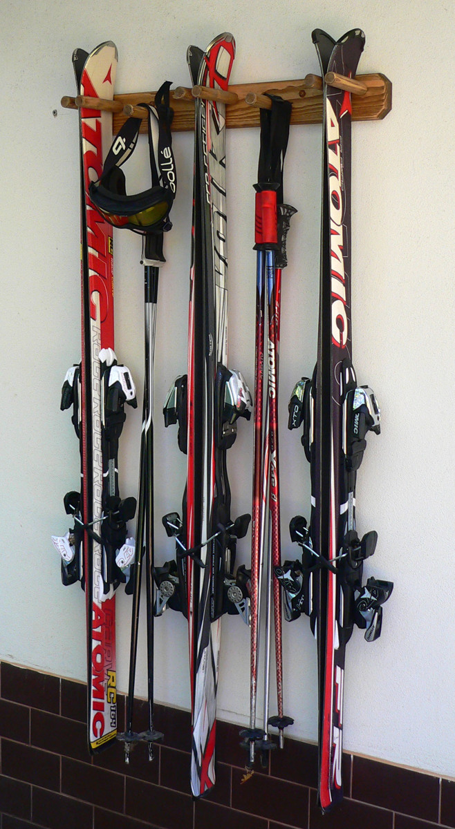 Stylový dřevěný nástěnný držák pro 3 páry lyží a hůlek vyrobený z masivu smrku a buku. Délka kolíku 14 cm a jejich vzdálenost 2 cm umožnuje pověšení různych typů lyží. Ideální pro instalaci v předsíni, garáží a pod. Jednoduchá montáž, vruty,hmoždinky a dřevěné krytky otvorů jsou součástí zásilky.