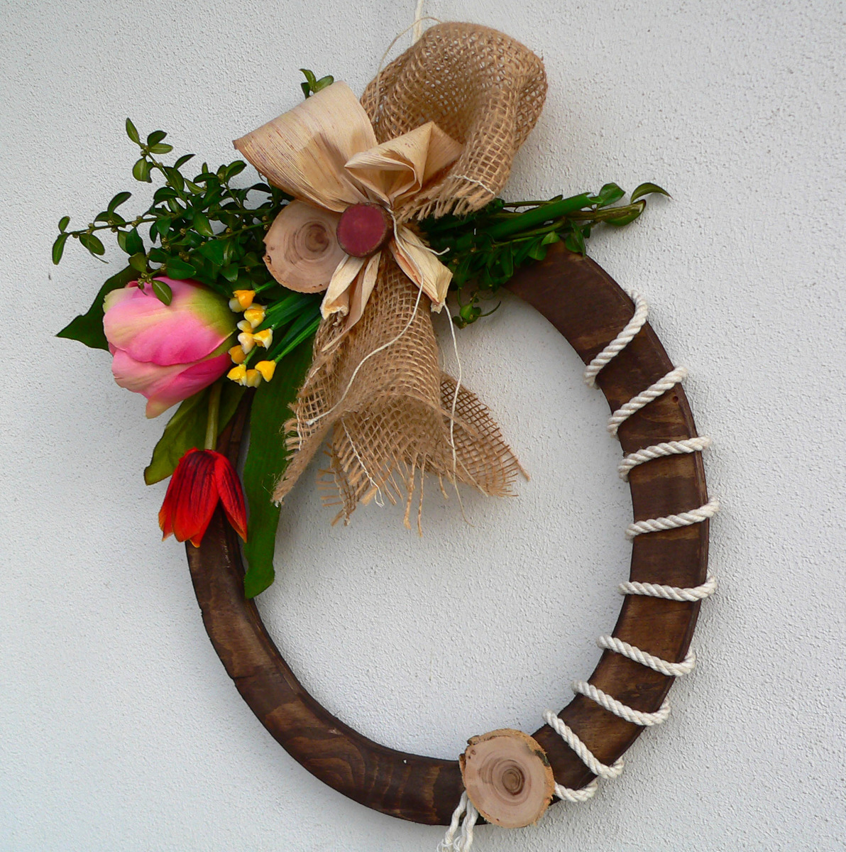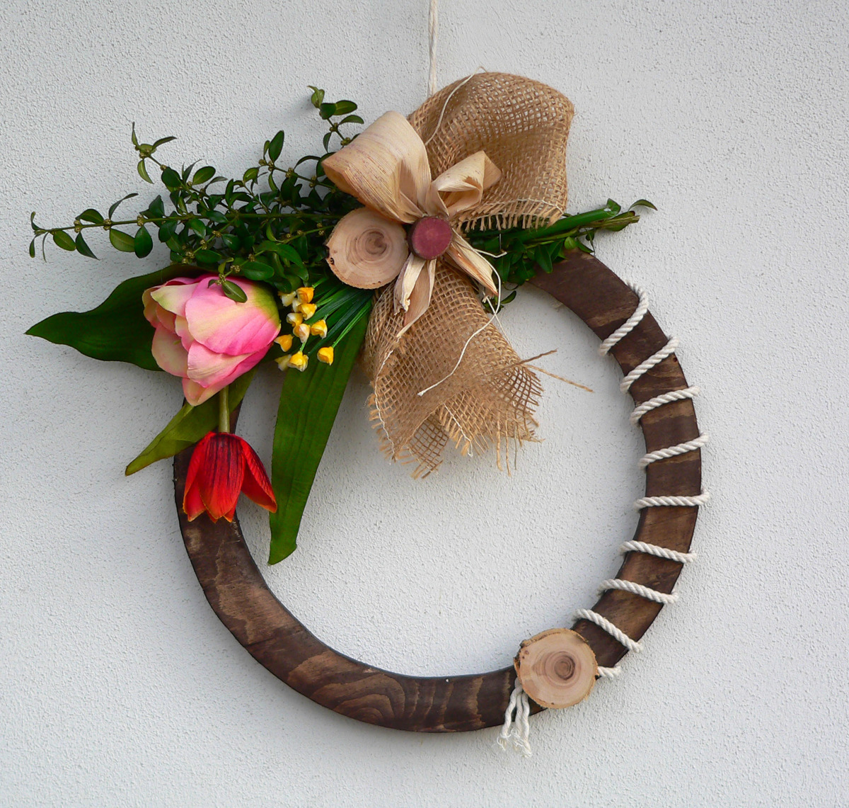 Přírodně nazdobený podzimní věnec s průměrem 35 cm.