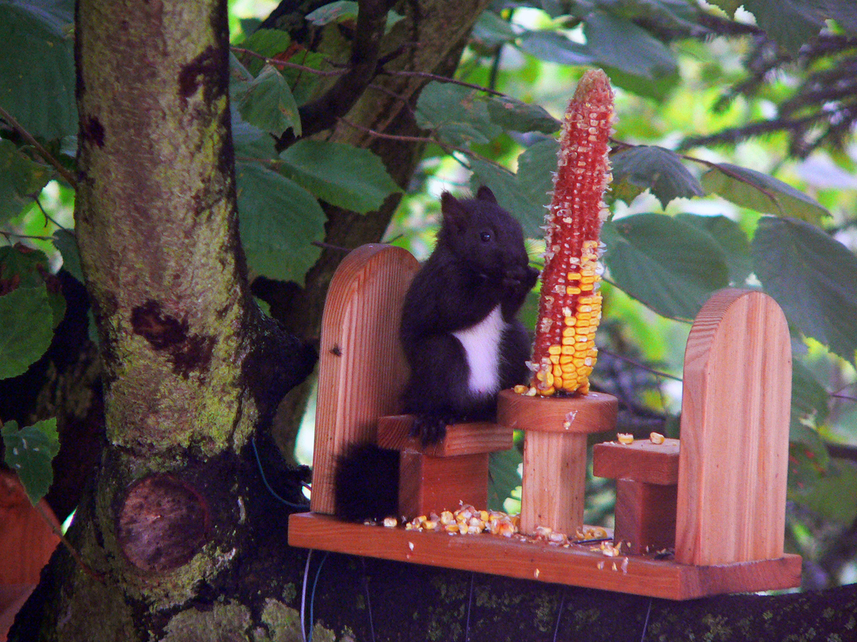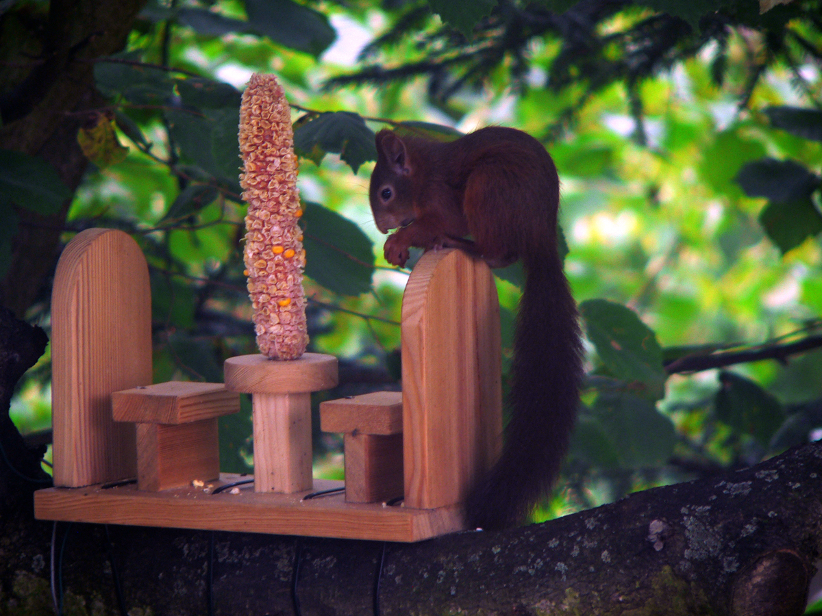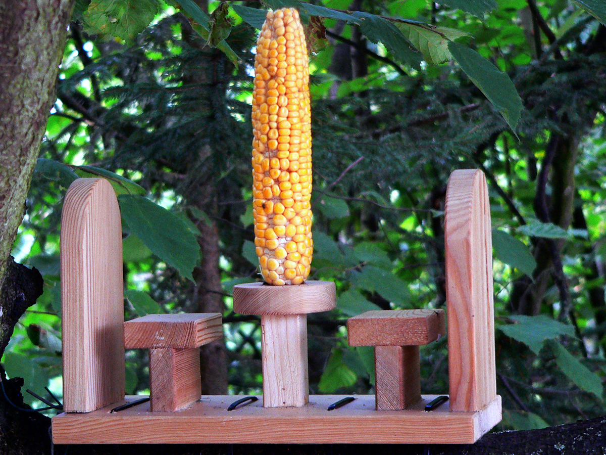 Krmítko pro veverky umožní udržet si veverky ve Vaší zahradě. Konstrukce krmítka má formu stolu s dvěma židlemi. Na stole je vrut na který se napichuje kukuřičný klas. Krmítko se připevní na horizontální větev stromu pomoci vázacích pásků, které jsou součásti dodávky.