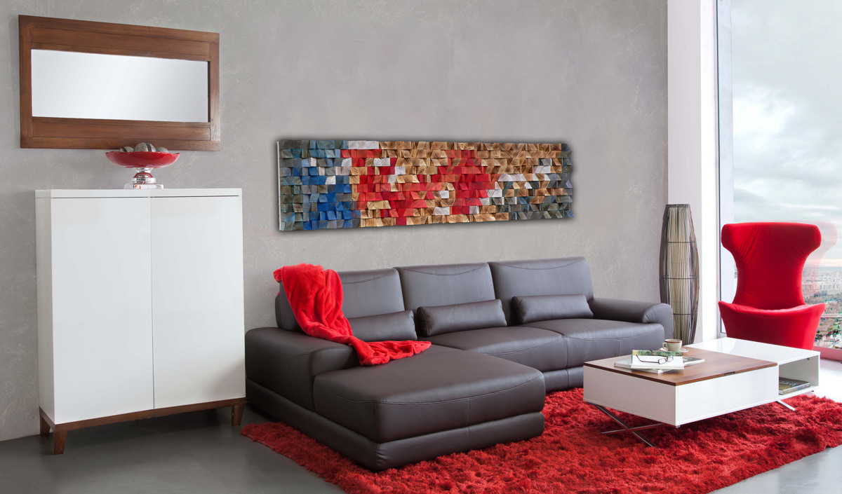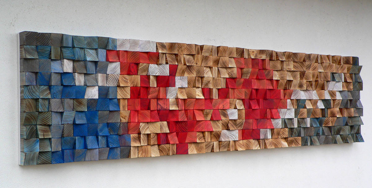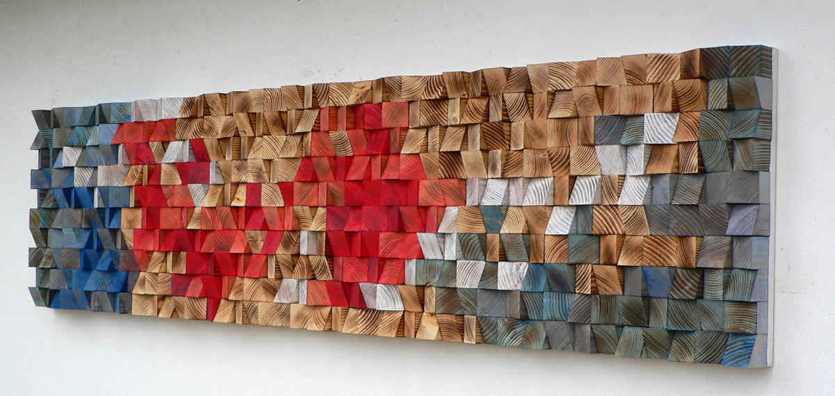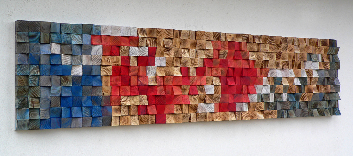 Nástěnná 3D dekorace vyrobena ze smrkových dřevěných kostiček. Každá kostička je ručně vyřezaná, obroušená, opálená a barevně upravená. Ošetřeno nezávadným bezbarvým akrylovým lakem. Unikátní design, každý kus je nezaměnitelný originál. Závésný systém v ceně. Vhodná do kancelářkých prostor, obyvacích prostor a pod.