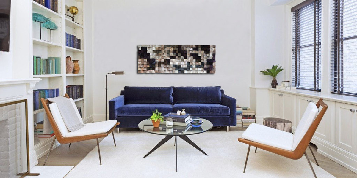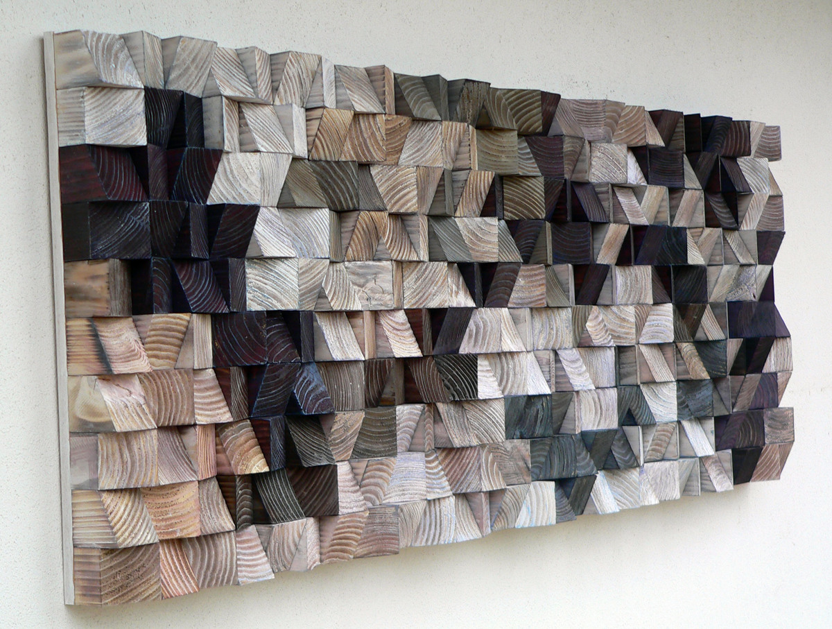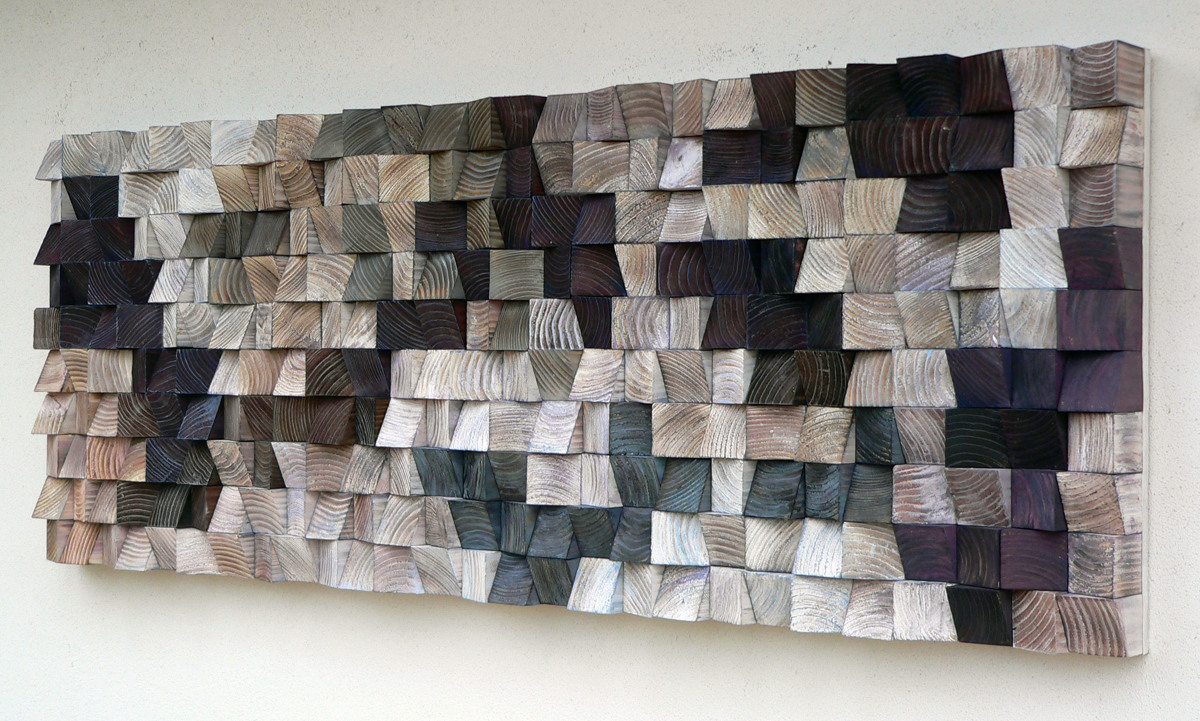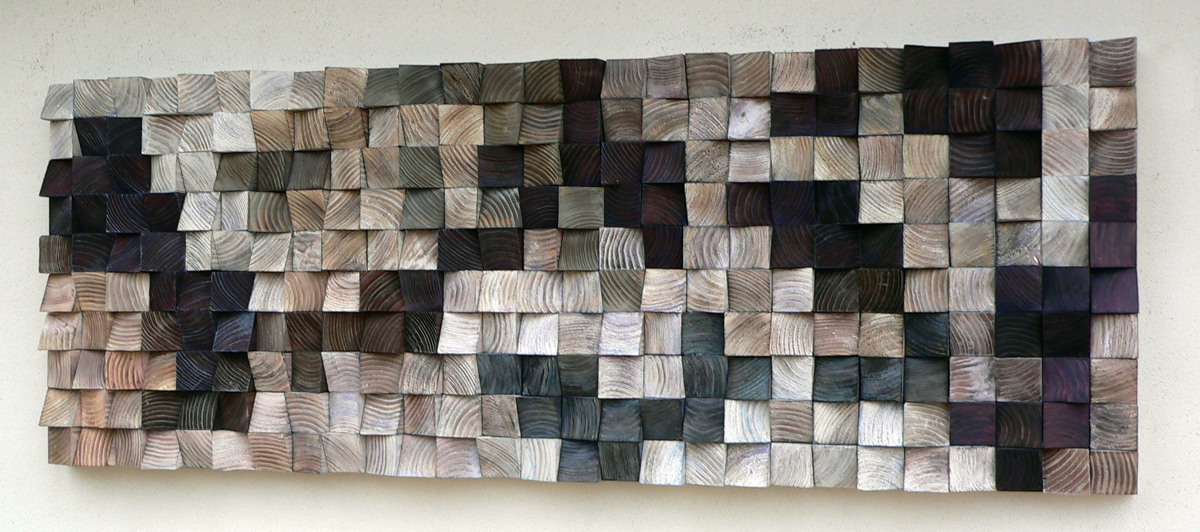 Nástěnná 3D dekorace vyrobena ze smrkových  dřevěných kostiček. Každá kostička je ručně vyřezaná, obroušená, opálená a barevně upravená. Ošetřeno nezávadným bezbarvým akrylovým lakem. Unikátní design, každý kus je nezaměnitelný originál. Závésný systém v ceně. Vhodná do kancelářkých prostor, obyvacích prostor a pod.