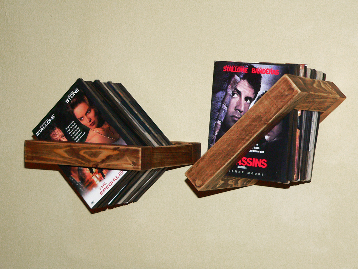 Moderní a praktická sada 2 poliček na knihy nebo DVD. Poličky jsou vyrobeny z masivu sibiřského modřínu a díky neobvyklé konstrukci umožňují atypické a atraktivní uložení knih nebo DVD. Poličky lze připevnit buď pod pod úhlem 45 stupňů nebo horizontálně případně i pod jiným úhlem. Kombinací několika poliček lze na stěně vytvořit neobvykle uspořádanou knihovnu.