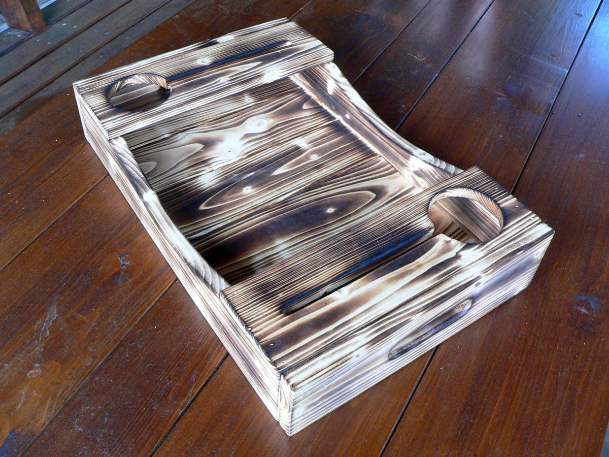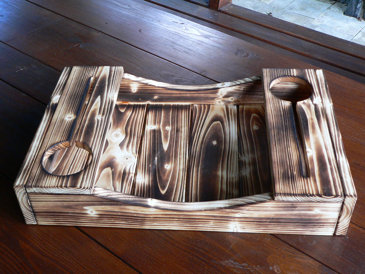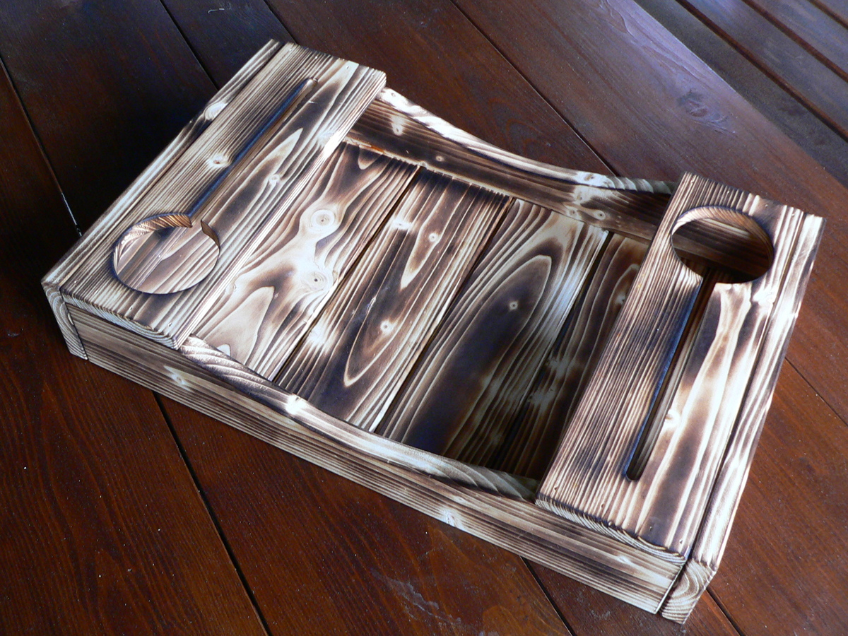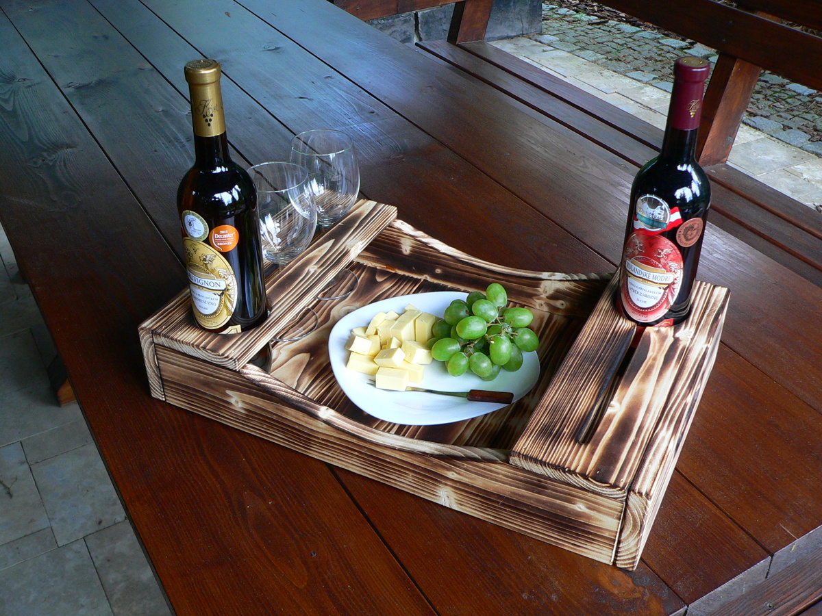 Dřevěný, ručně vyráběný podnos Drink pro servírování vína a pohoštění. Určený pro standartní sklenice na víno a láhve 0,7l. Umožňuje bezpečné přenášení až 2 lahví vína a 4 sklenic na víno bez hrozby převrhnutí.