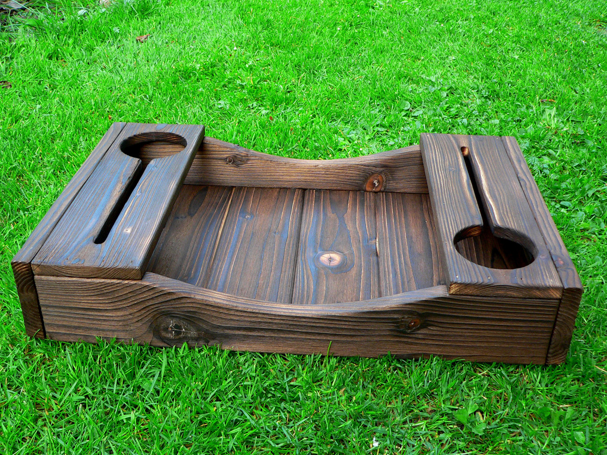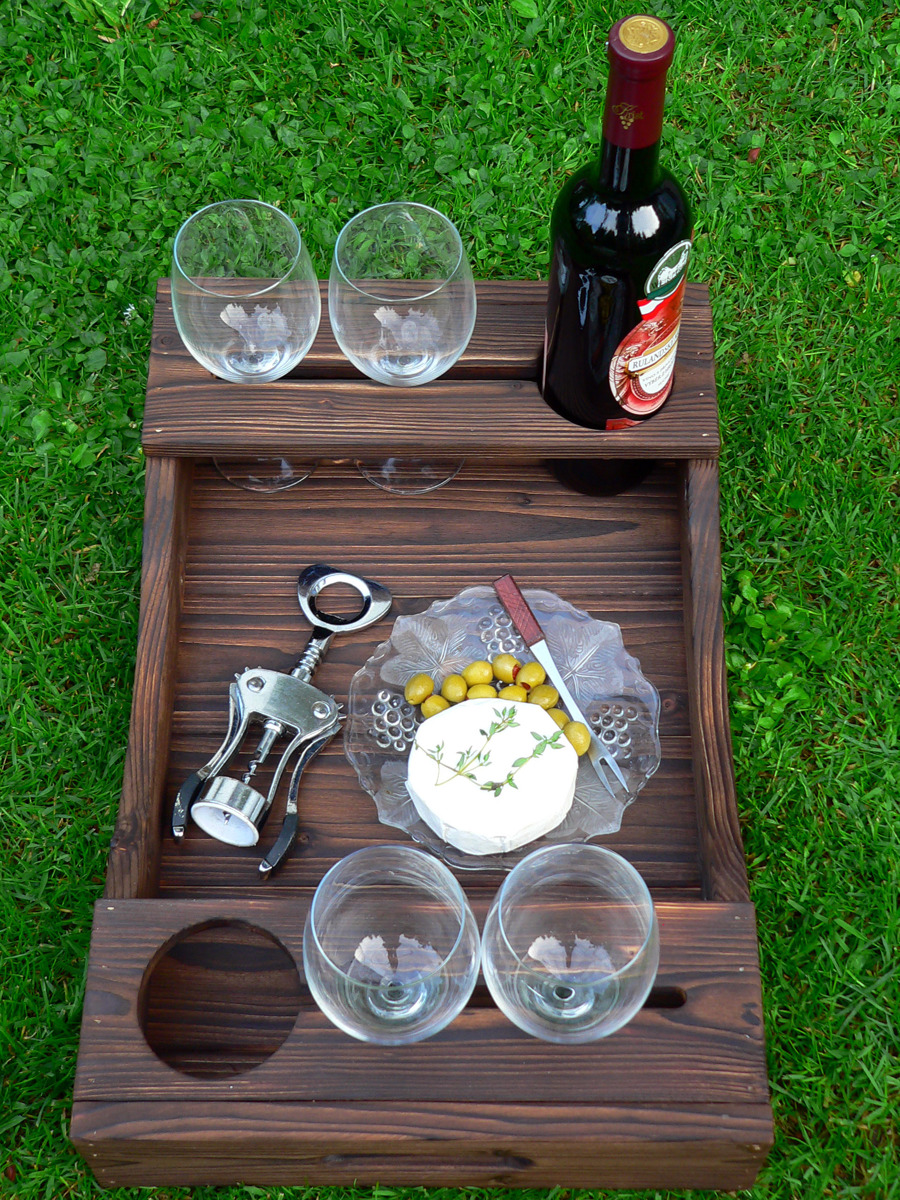 Dřevěný, ručně vyráběný podnos Lux pro servírování vína a pohoštění. Určený pro standartní sklenice na víno a láhve 0,7l. Umožňuje bezpečné přenášení až 2 lahví vína a 4 sklenic na víno bez hrozby převrhnutí.