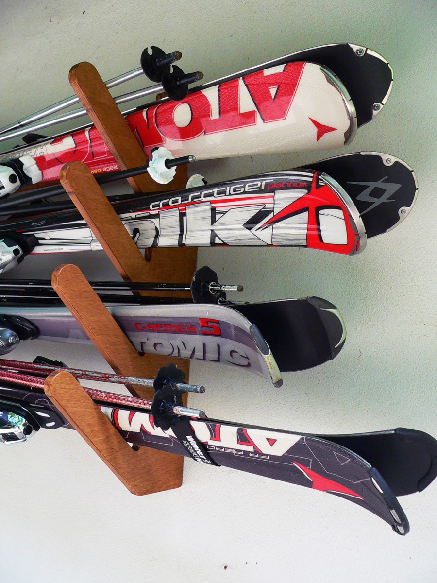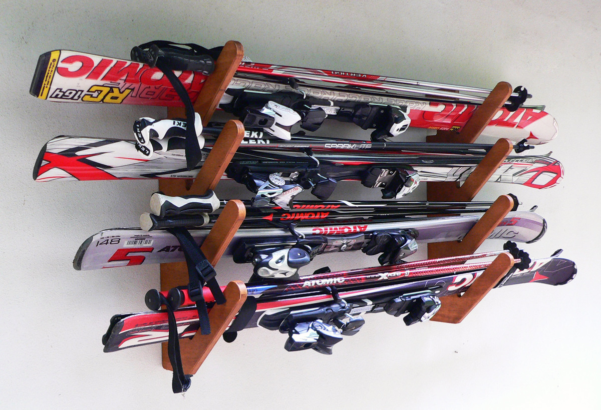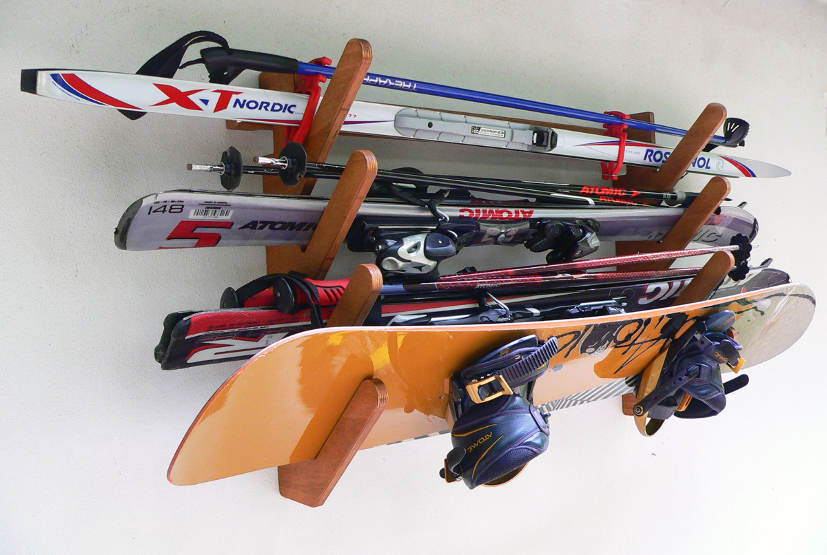 Univerzální držák na sjezdové lyže, běžky a snowboardy. Držák umožňuje horizontální uložení libovolné kombinace 4 párů sjezdových a běžeckých lyží anebo 2 párů lyží a 2 snowboardů. Je vyroben z prvotřídní bukové překližky, tl.18 mm. Jednoduchá montáž. Ideální pro chaty, pensiony, ubytovny, předsíně, garáže, atd.