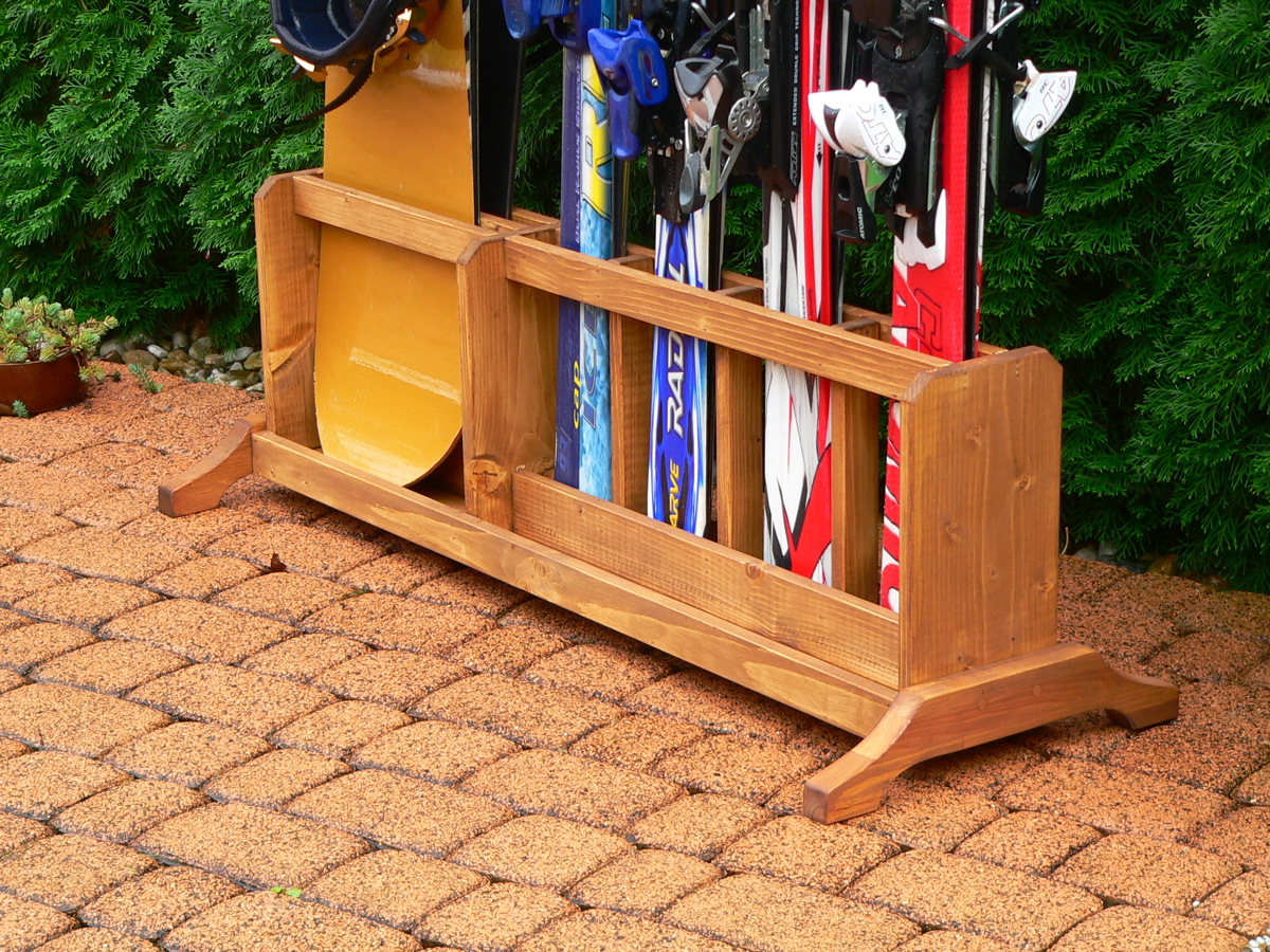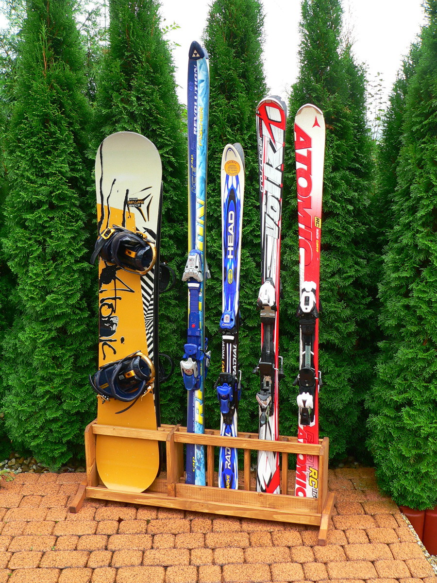 Praktický, skladný, volně stojící, přenosný dřevěný stojan na 4 páry lyží s patkami širokými až 14 cm a 2 snowboardy s patkami širokými až 35 cm vyrobený ze smrkového masivu. Dodat lze i variantu pro 4 snowboardy a 2 páry lyží. Stojan je stabilní, bez nutnosti fixace k podlaze. Stojan je vhodný pro použití na chatách, chalupách, ski půjčovnách, atd. Vzhledem k malým rozměrům není problém jej umístnit v garáži, předsíni, terase, balkoně apod. Stojan má odtokové otvory pro tající sníh.