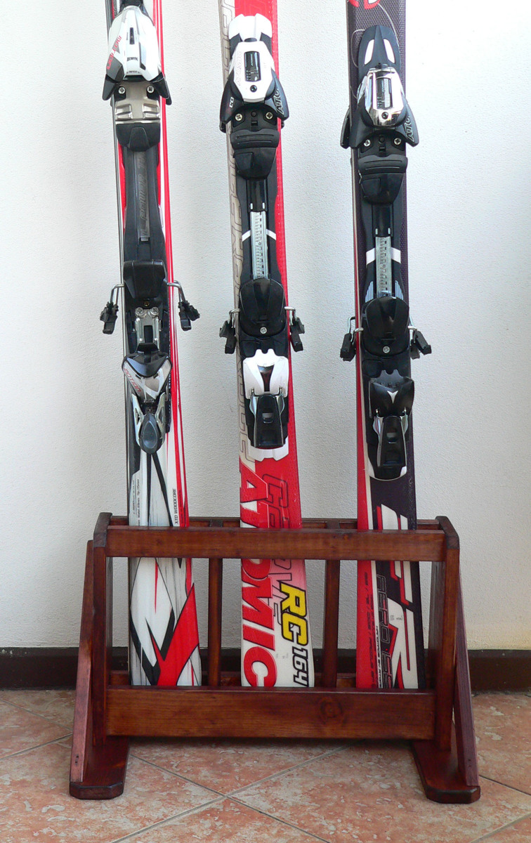 Praktický, skladný, volně stojící, přenosný dřevěný stojan na 3 páry lyží s patkami širokými až 14 cm vyrobený ze smrkového masivu. Stojan je stabilní, bez nutnosti fixace k podlaze. Stojan je vhodný pro použití na chatách, chalupách, ski půjčovnách, atd. Vzhledem k malým rozměrům není problém jej umístnit v garáži, předsíni, terase, balkoně apod.